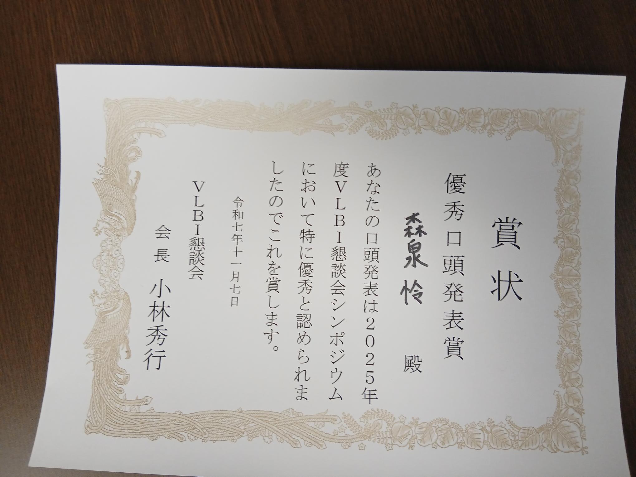 | 賞の名称 | 2025年度VLBI懇談会シンポジウム 優秀口頭発表賞 |