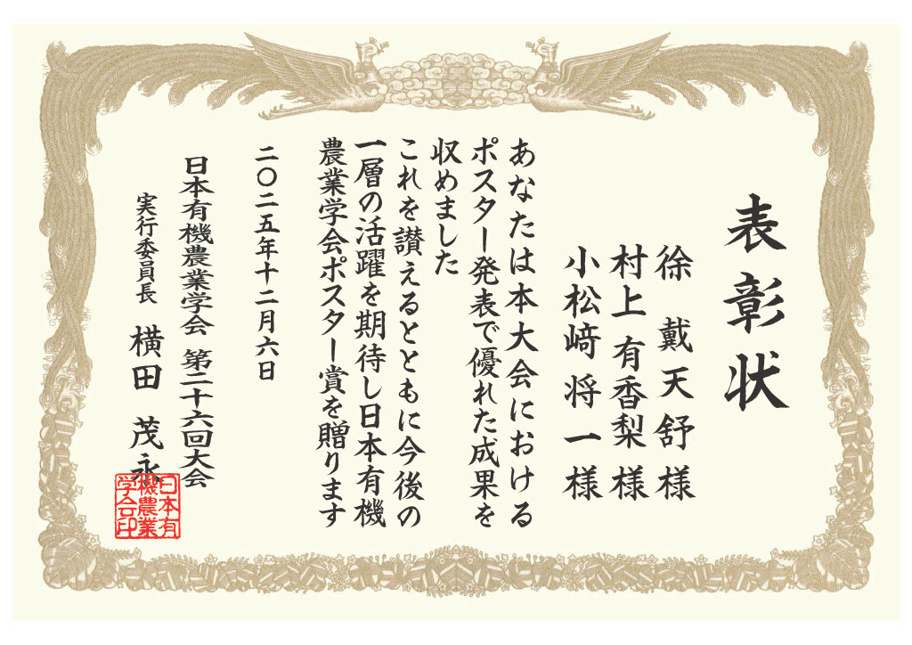 | コメント | このたびは、日本有機農業学会第26回大会において優秀ポスター賞を賜り、誠にありがとうございます。このような栄誉ある賞を頂戴し、大変光栄に存じます。 本研究を進めるにあたり、日頃より多大なるご指導とご助言を賜りました小松﨑将一教授をはじめ、研究の遂行に際してご支援・ご協力くださいました多くの皆様に、心より御礼申し上げます。 本研究は、これまで積み重ねられてきた先行研究の成果を基盤とし、長期的な視点から継続して取り組んできたものであり、今回の受賞を、その過程における重要な成果として大変意義深く受け止めております。今後も、本大会を通じて頂戴いたしました貴重なご意見を糧に、本研究のさらなる発展を目指し、真摯に研究活動に取り組んでまいります。 |